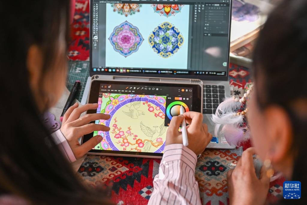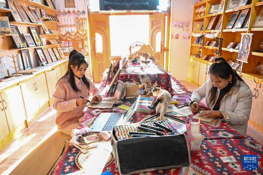 在新疆墨玉县桑皮纸产业园,穆耶赛尔·艾合麦提托合提(左)在工作室内设计桑皮纸文创产品的图案(1月13日摄)。