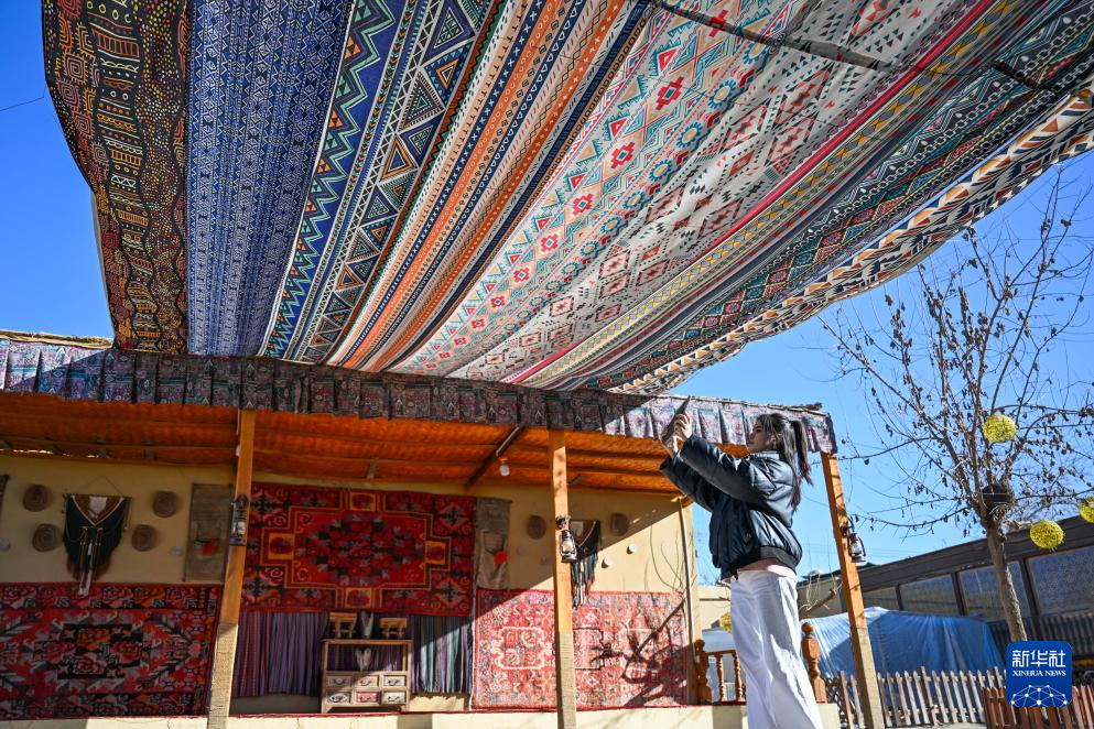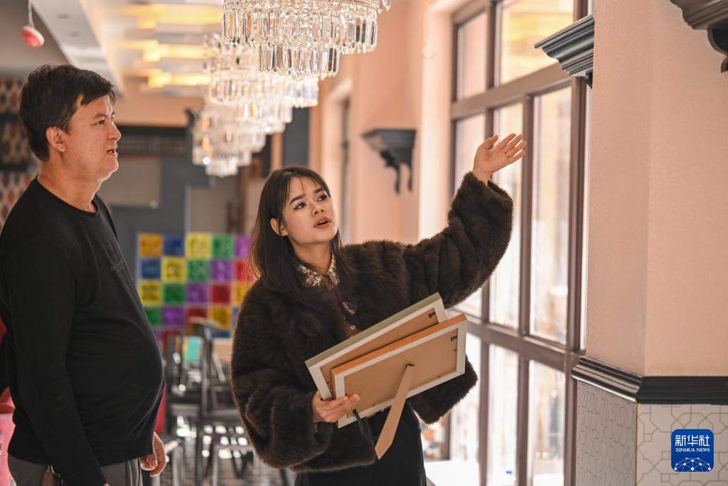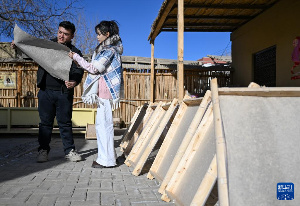 在新疆墨玉县普恰克其镇,穆耶赛尔·艾合麦提托合提(右)为一家即将开业的桑皮纸主题餐厅设计桑皮纸元素软装(1月12日摄)。