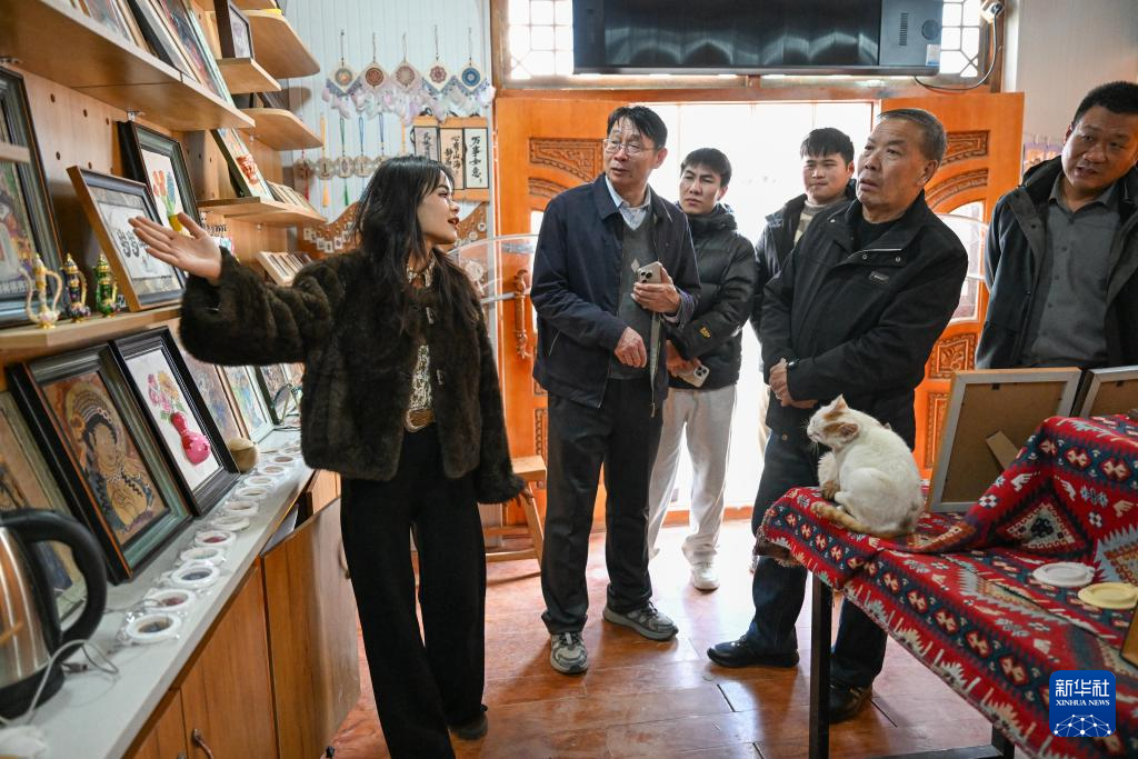 在新疆墨玉县桑皮纸产业园,穆耶赛尔·艾合麦提托合提(左一)在工作室内向游客介绍自己创作的桑皮纸文创产品(1月12日摄)。