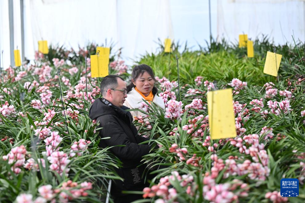 1月14日,在位于周宁县浦源镇的宁德向山兰园植物科技有限公司花卉大棚内,周宁县花卉办工作人员(左)与企业管理人员查看大花惠兰长势。