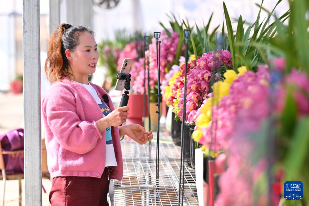 1月15日,在位于周宁县七步镇的鸿腾农业开发有限公司花卉大棚内,工作人员在电商直播大花惠兰盆栽。