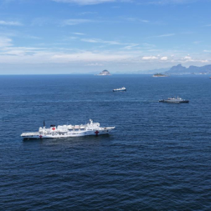 1月15日,在巴西里约热内卢附近海域,执行“和谐使命-2025”任务的“丝路方舟”号医院船与巴西海军舰艇开展海上联合演练。