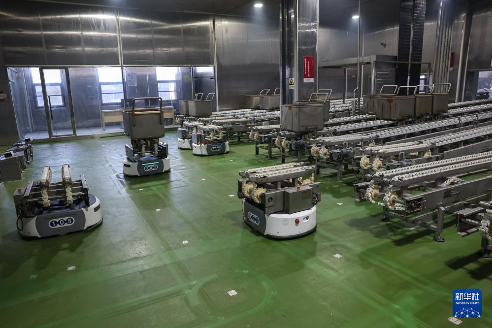 1月15日,在四川川娃子食品有限公司智能生态工厂,AGV小车在搬运烧椒酱物料。