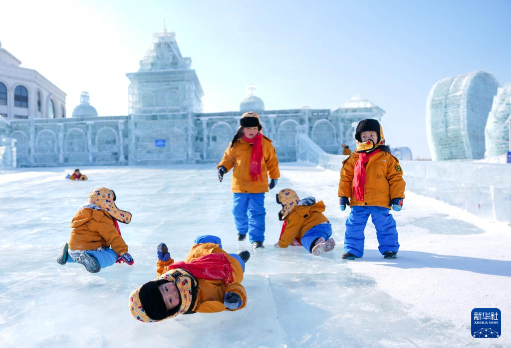 1月14日,“小砂糖橘”在位于吉林长春的长春冰雪新天地玩冰滑梯。