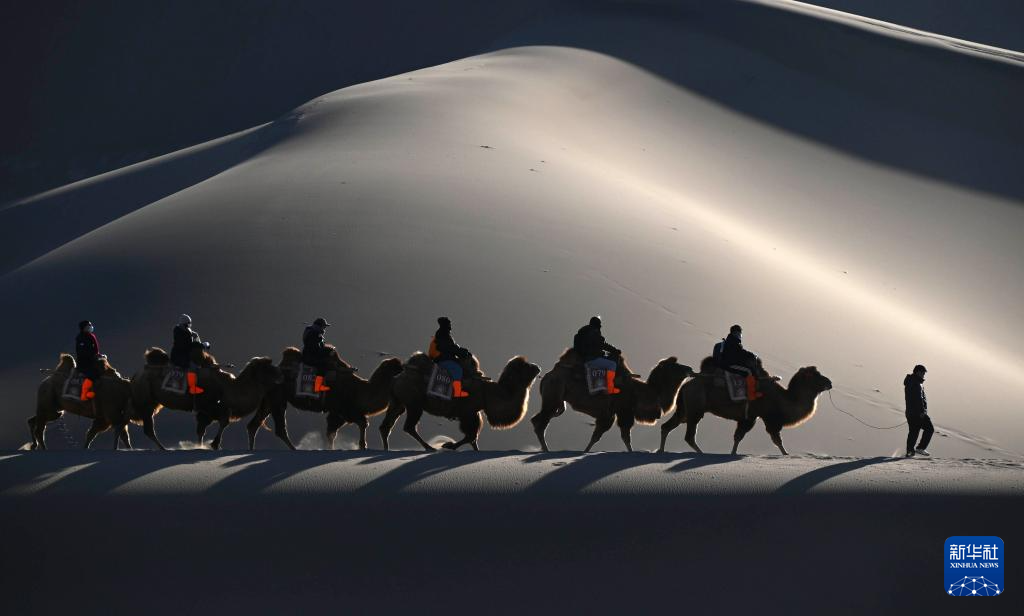 1月10日,游客在甘肃省敦煌市鸣沙山月牙泉景区游览。