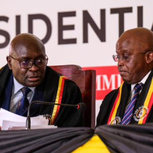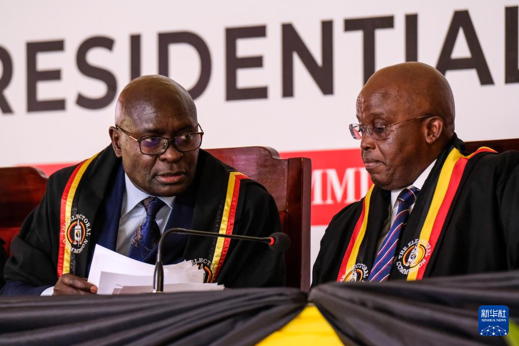 1月17日,在乌干达首都坎帕拉国家计票中心,乌干达选举委员会主席西蒙·比亚巴卡马(左)宣布总统选举结果。