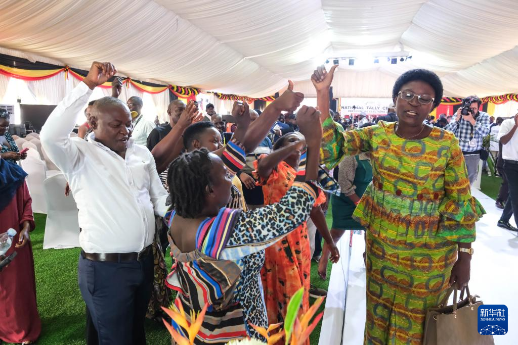 1月17日,在乌干达首都坎帕拉国家计票中心,执政党全国抵抗运动成员庆祝穆塞韦尼赢得总统选举。