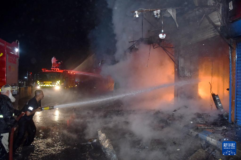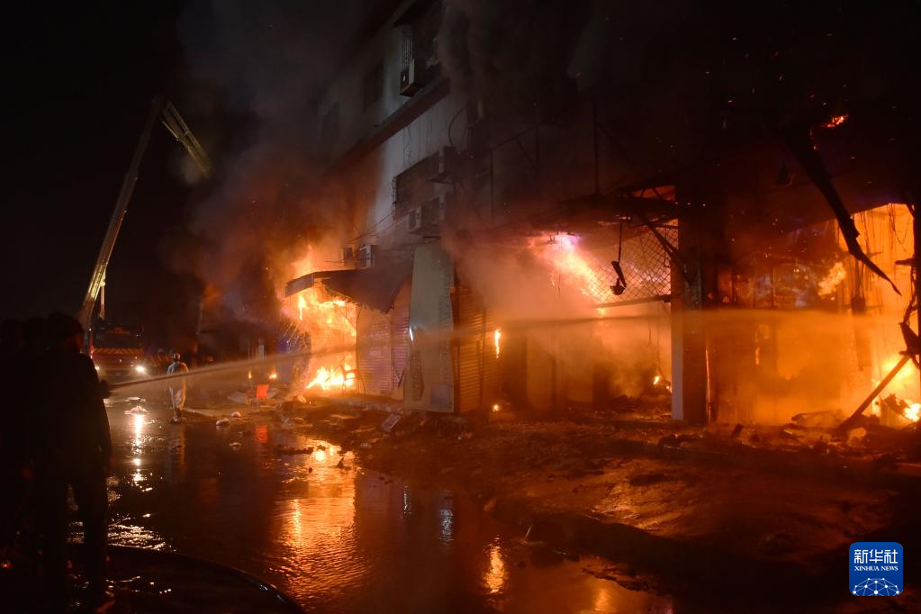 1月18日,消防员在巴基斯坦卡拉奇的火灾现场灭火。