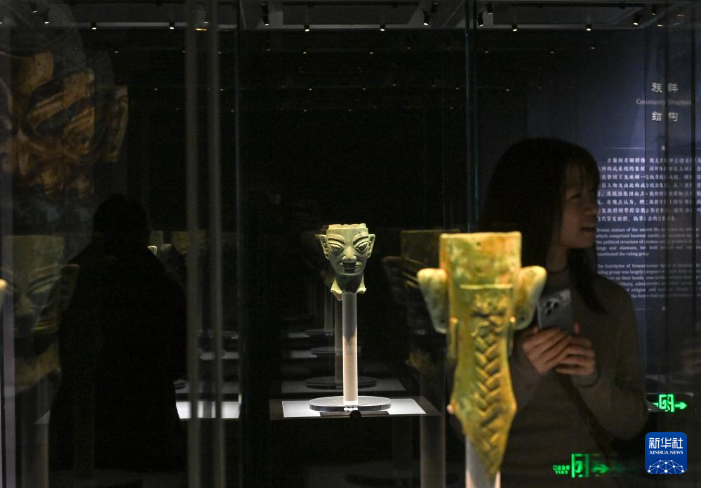 这是展出的戴金面罩青铜人头像(1月18日摄)。