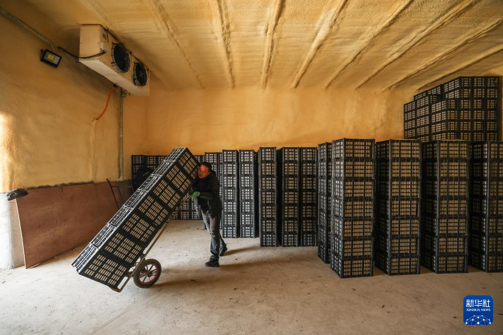 1月20日,村民在祝家沟村新建的恒温库内搬运水果。