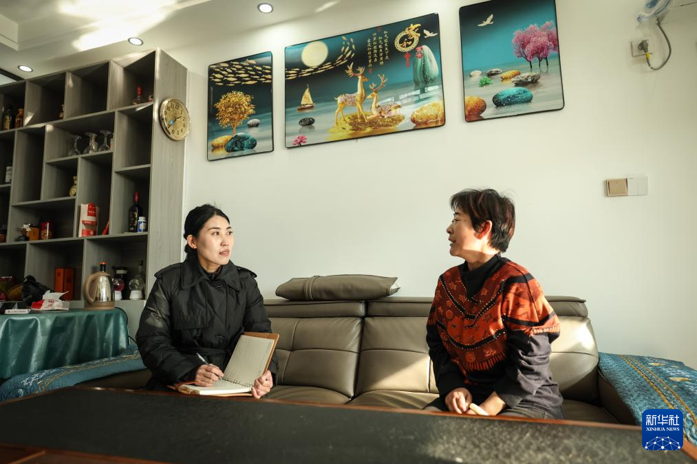 1月20日,祝家沟村党支部书记王丽丽(左)在村民家了解近期生活情况。