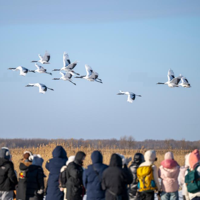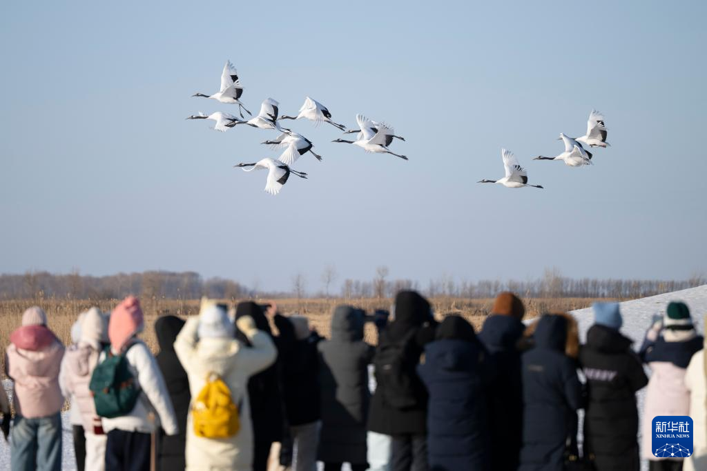 1月21日,游客在黑龙江扎龙国家级自然保护区内观看丹顶鹤。