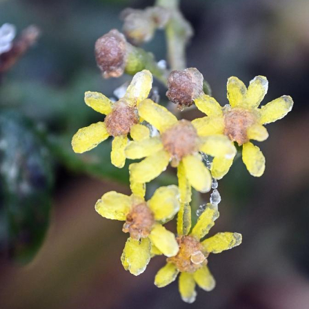 这是1月21日在三江侗族自治县大塘坳水库附近拍摄的被冰凌包裹的花朵。