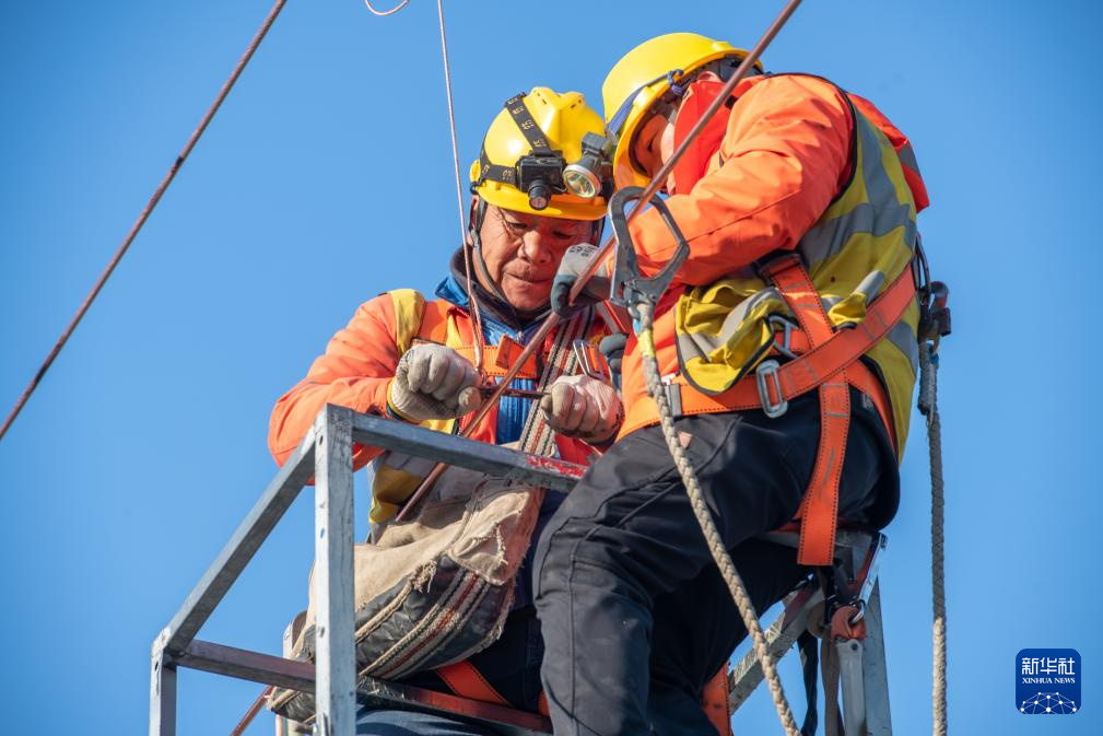 1月22日,在位于江苏省南京市浦口区的京沪线林场站,铁路供电职工在进行接触网施工作业。