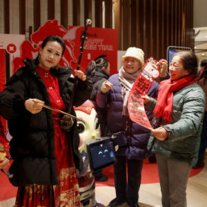 1月23日,在湖北省迎新春新民乐惠民展演现场,演员与观众互动。