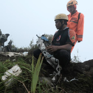1月18日,在印度尼西亚南苏拉威西省庞卡杰内和群岛县布卢萨拉翁山,救援人员在失联飞机残骸旁工作。