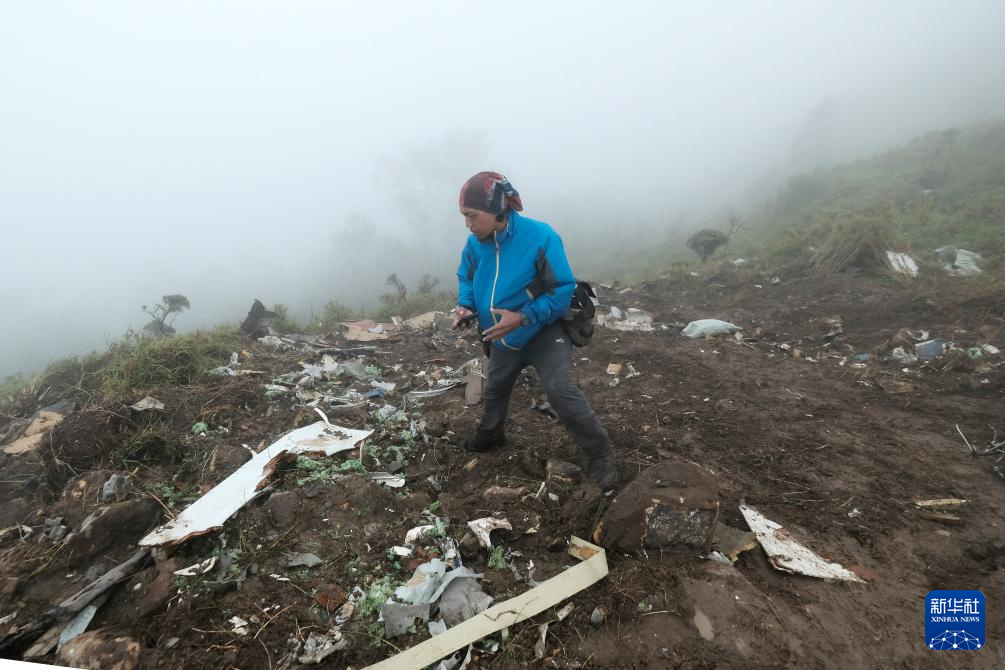 1月18日,在印度尼西亚南苏拉威西省庞卡杰内和群岛县布卢萨拉翁山,救援人员站在失联飞机残骸旁。