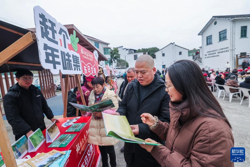 1月23日,村民在东白湖镇乡村年味大集现场的特色集市上翻看介绍当地人文环境的画册。