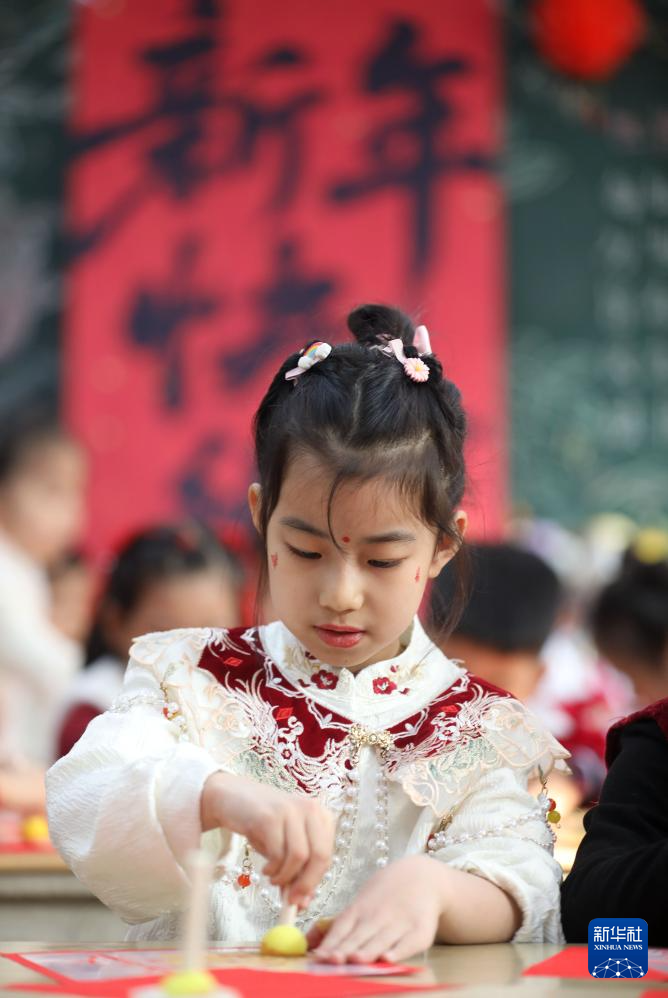1月23日,在河北省石家庄市第三幼儿园举办的“多彩民俗迎腊八”主题活动中,小朋友体验传统民俗。