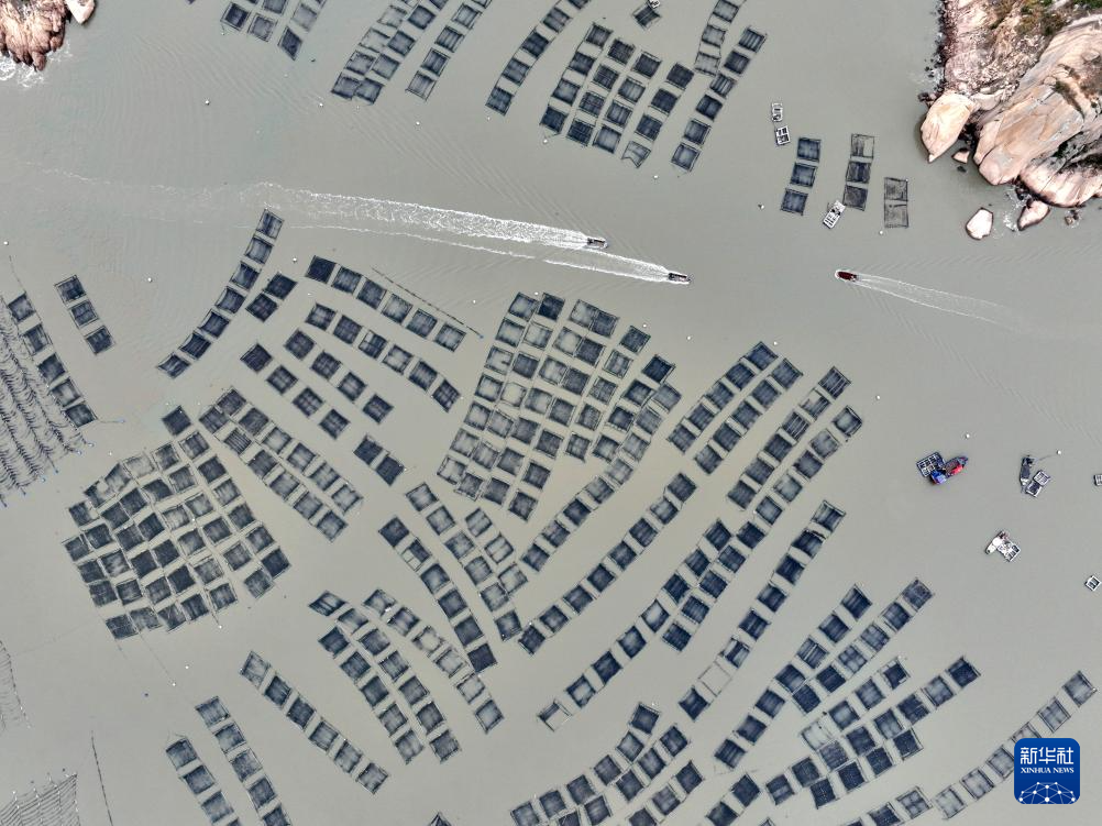 1月23日,船只行驶在福建省宁德市霞浦县下浒镇海上养殖区(无人机照片)。