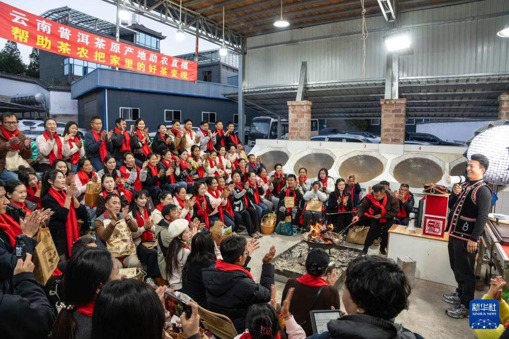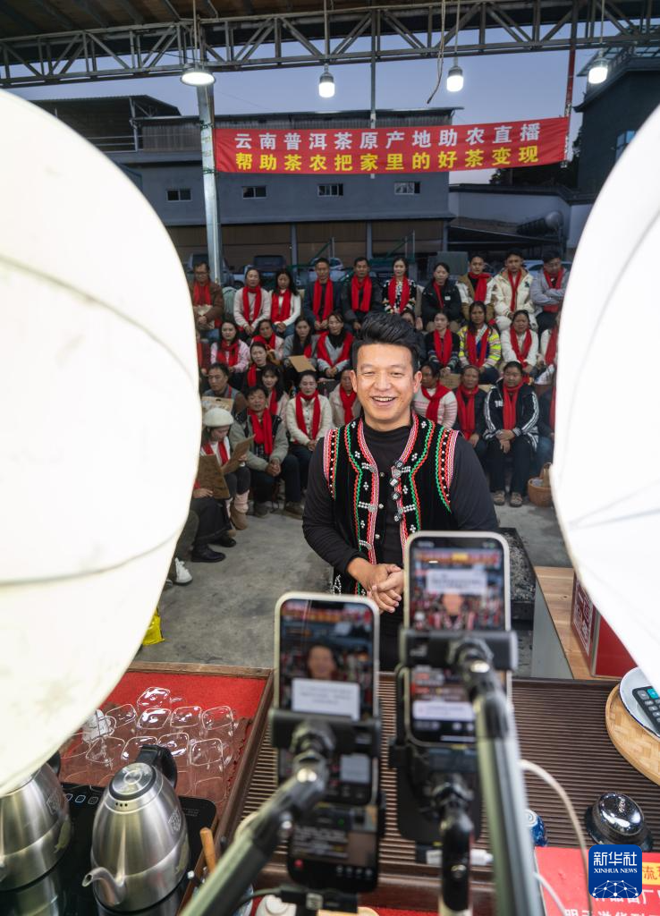 1月22日,茶农在临沧市双江县勐库镇参与茶叶推介直播。