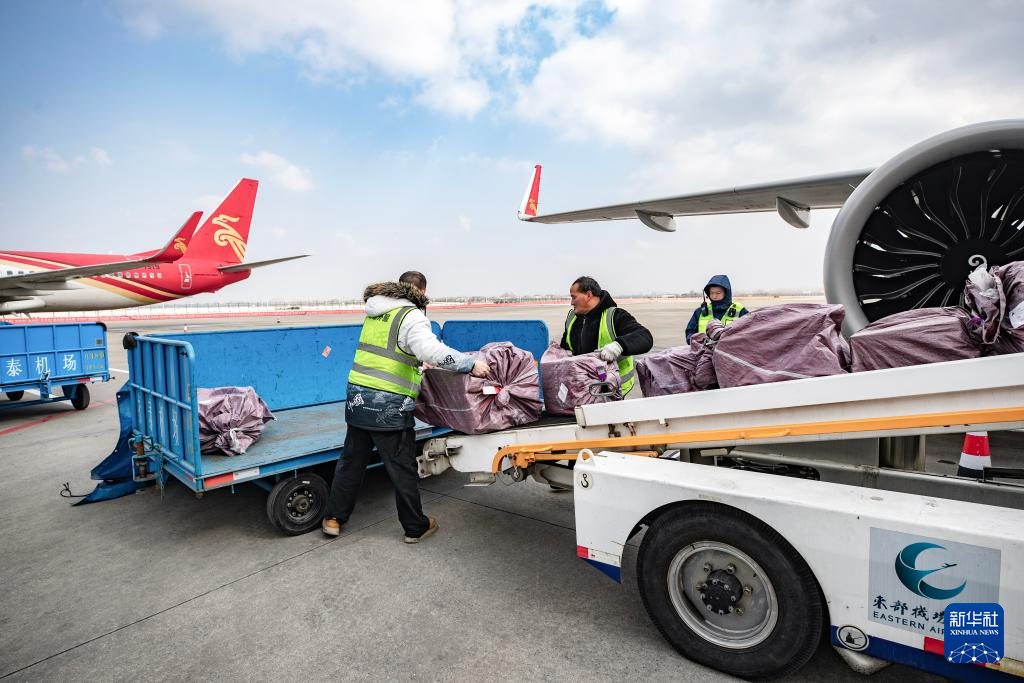 1月28日,装卸人员在扬州泰州国际机场装卸货物。