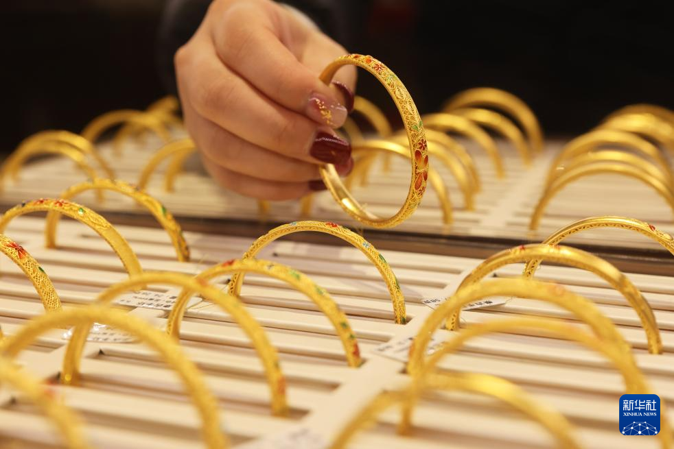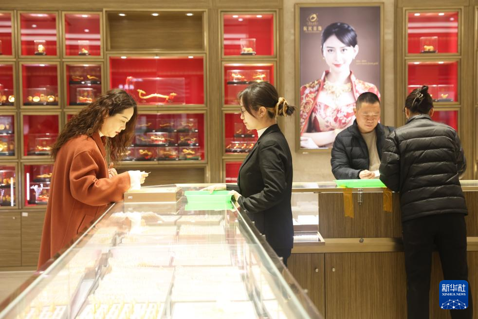 1月28日,顾客在位于浙江省杭州市萧山区瓜沥镇的杭州航民百泰首饰有限公司展厅挑选黄金首饰。
