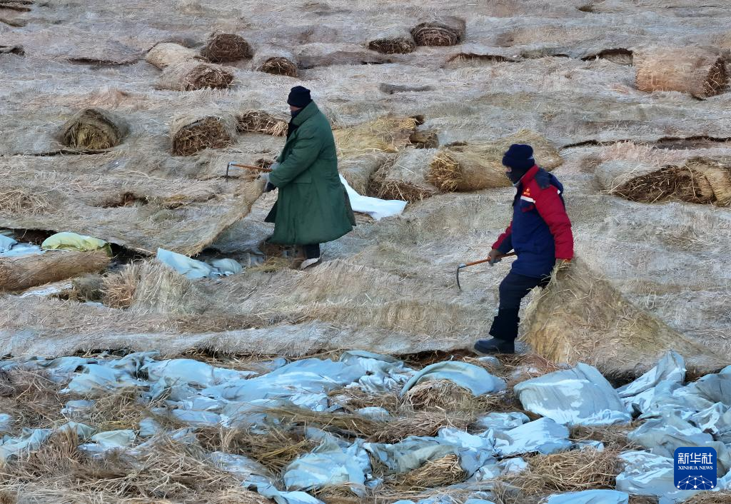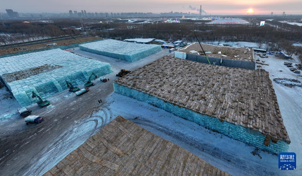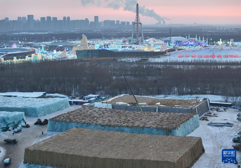 1月22日,工人在哈尔滨冰雪大世界储冰场上为冰块盖上遮盖物(无人机照片)。