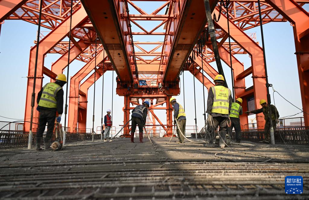 1月28日,中铁十一局承建的深江铁路跨沿江高速特大桥移动模架现浇简支梁施工任务过半,建设有序推进。