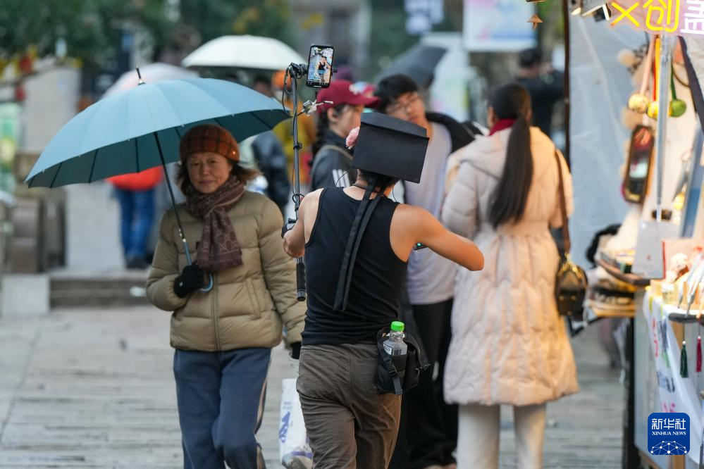 1月21日,在重庆市网红地标洪崖洞,主播在滨江路人行道上架设设备直播。