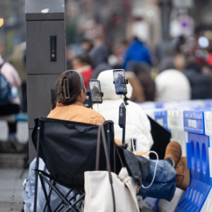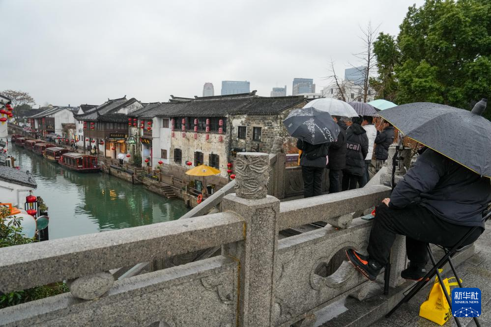 1月26日,在苏州市山塘街,一名主播(右一)携带折叠椅、直播器材长期占道直播。