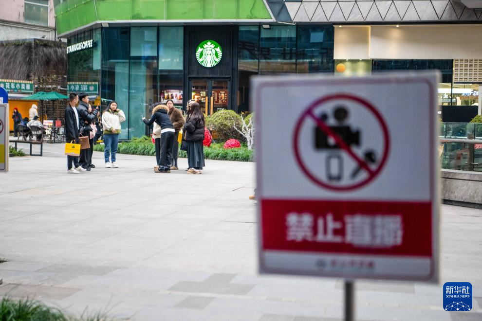 1月23日,在重庆市观音桥商圈,主播无视禁止标识进行直播。