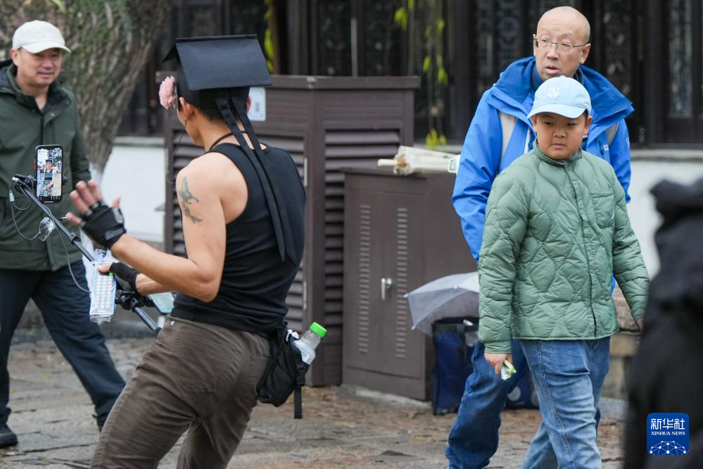 1月26日,在苏州市平江路,一名主播手持直播设备、便携音响边走边唱,“游街式”直播的喧闹声响吸引行人侧目。