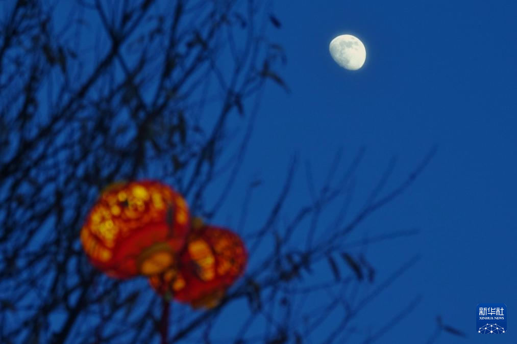 1月29日,在黑龙江省同江市,灯笼与月亮相映成趣。