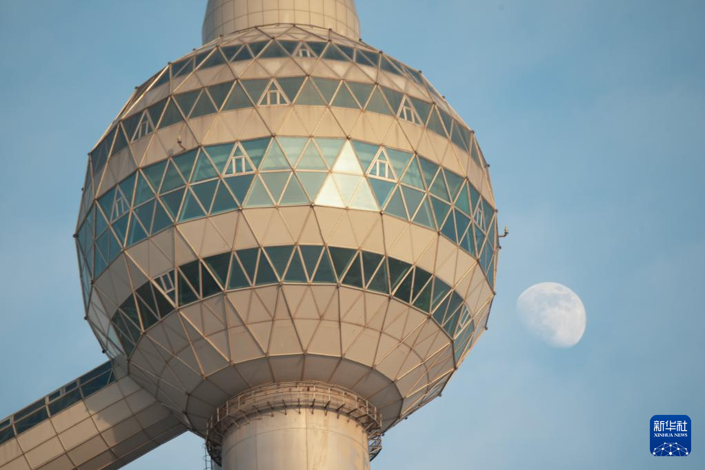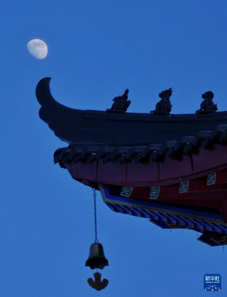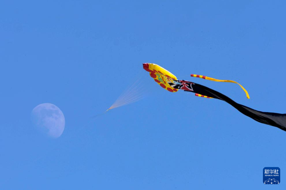 1月29日,在黑龙江省齐齐哈尔市,月亮与风筝相映成趣。
