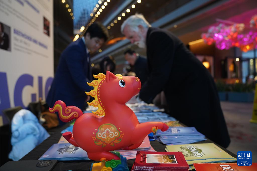 1月28日,在美国费城,吉祥物幸运马摆放在“你好!中国”旅游推介系列活动签到处。
