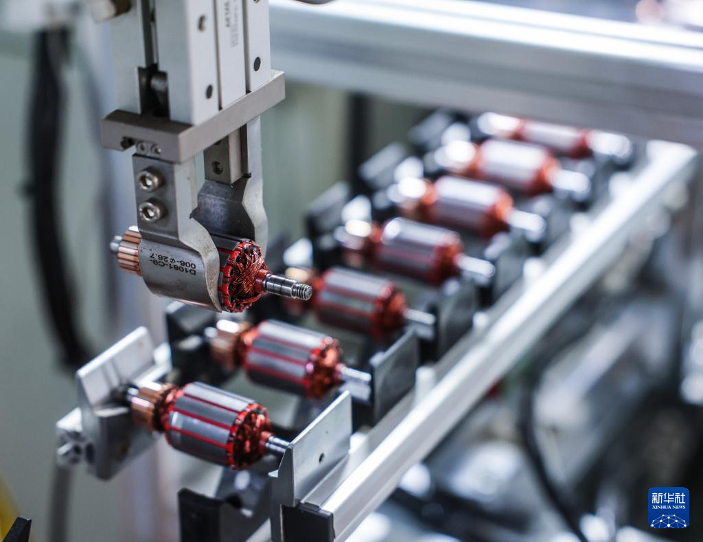 1月29日,在位于金华市金东区的金顺工具有限公司车间内,流水线上在生产电机定子。该公司是一家从事喷枪、喷涂机等喷涂技术与产品研发、制造和销售的国家高新技术企业、国家专精特新“小巨人”企业,产品出口销往欧美97个国家和地区,授权专利197项。