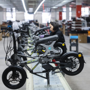 1月29日,在位于金华市金东区的浙江锋鸟车业有限公司组装车间内,工人在流水线上组装折叠电动自行车。该公司主要专注于出行细分领域智能短途代步工具的开发,集设计、研发、生产、销售于一体,其产品线涵盖超能折叠车、高性能电动自行车、家用轻电车,是国家高新技术企业和浙江省专精特新中小企业。
