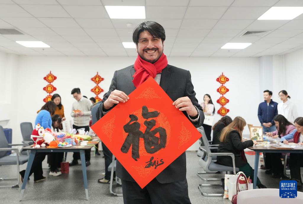 1月29日,在中国残联2026年迎新春中外交流活动上,外国嘉宾展示他书写的福字。