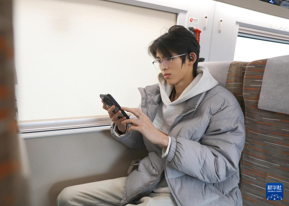 1月27日,G6686次列车“静音车厢”内,一名旅客佩戴耳机浏览短视频。