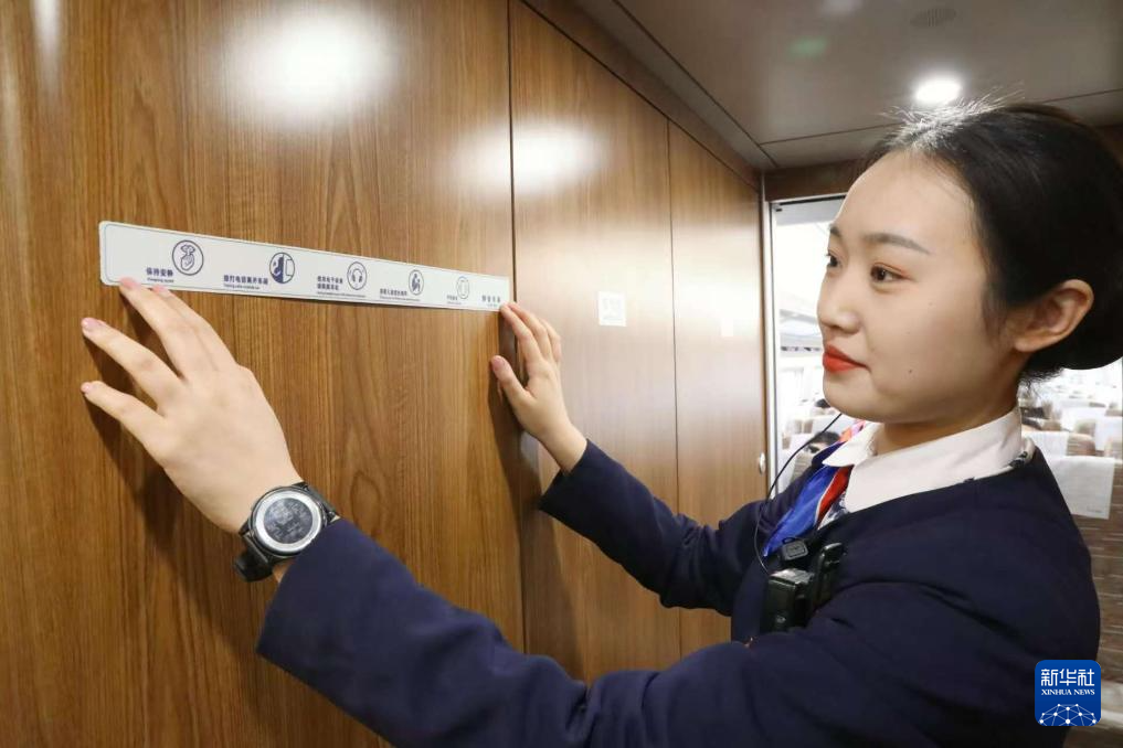 1月27日,G6686次列车工作人员在“静音车厢”内检查标识。