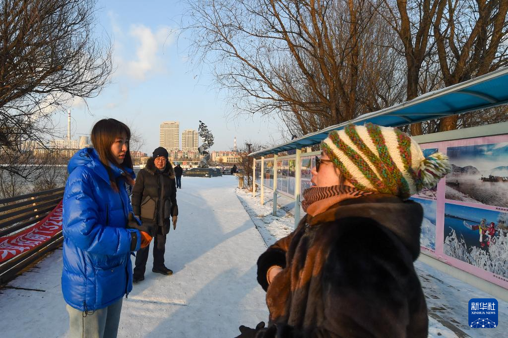 1月28日,王婷婷(左一)在长白岛给游客讲解鸟类知识。