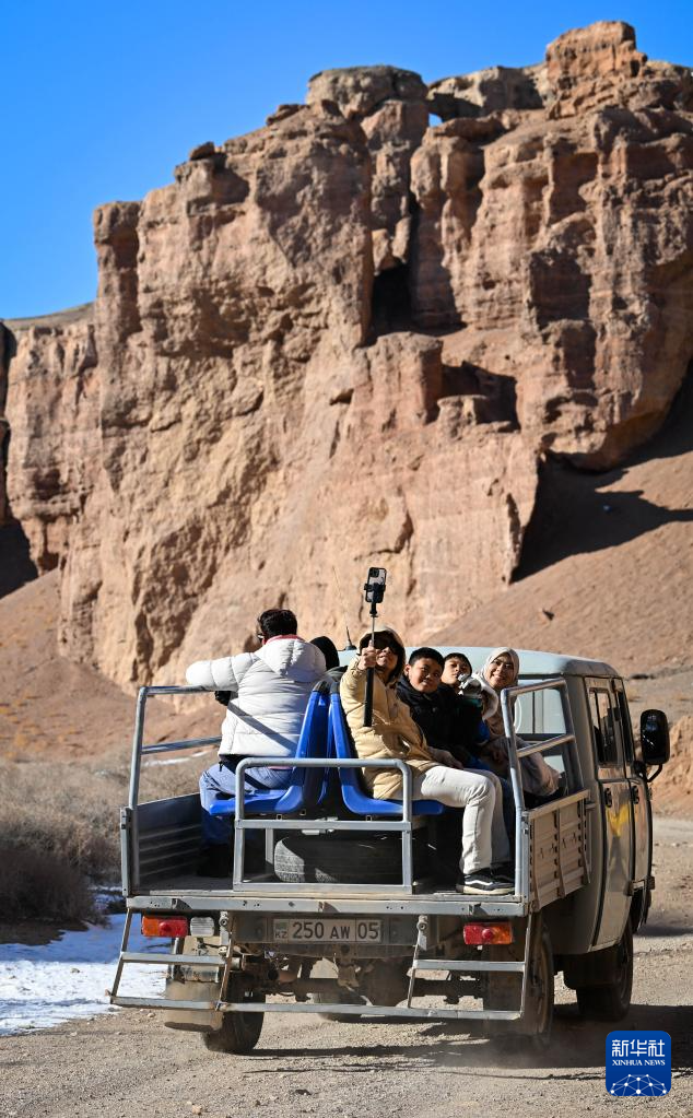1月30日,在哈萨克斯坦阿拉木图州,游客乘坐观光车在恰伦峡谷游览。