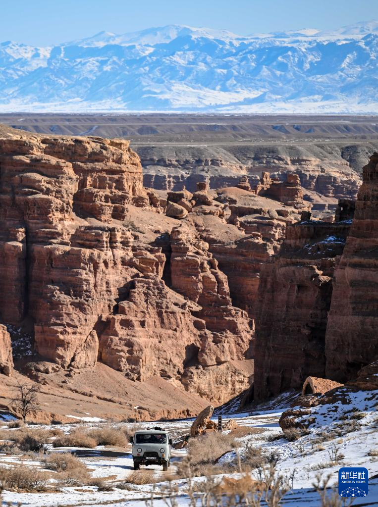 1月30日,在哈萨克斯坦阿拉木图州,一辆观光车行驶在恰伦峡谷。