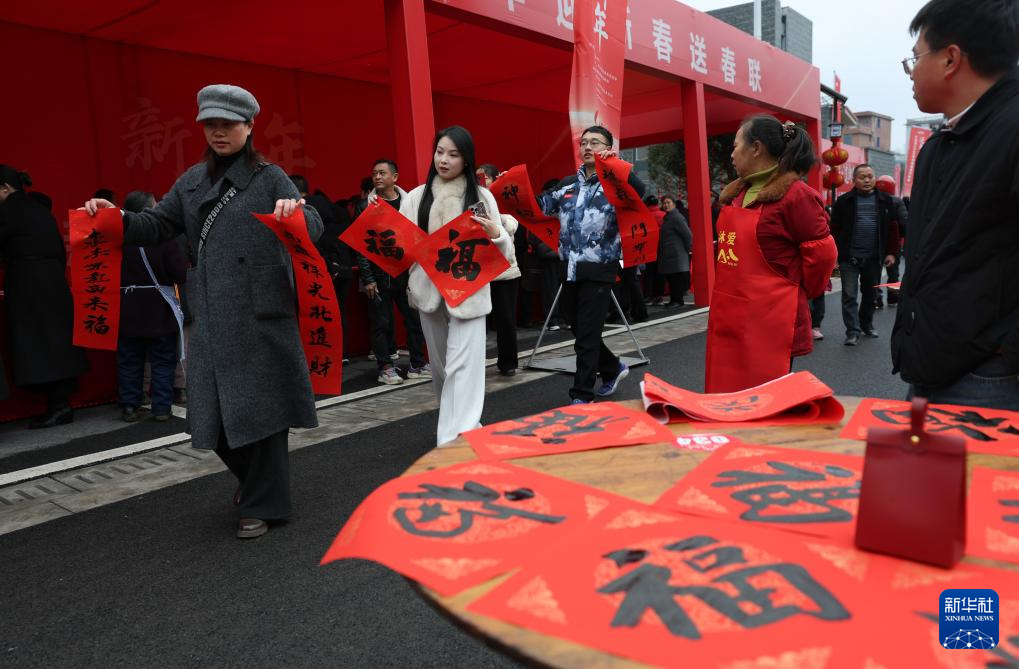 1月31日,在四川省宜宾市筠连县沐爱镇金坪村搬迁安置区,受灾群众领取春联。