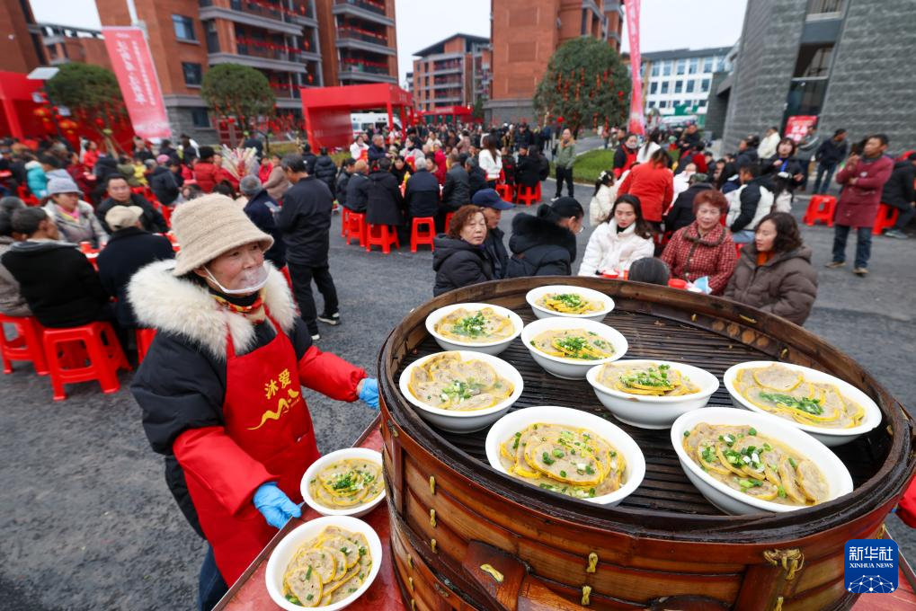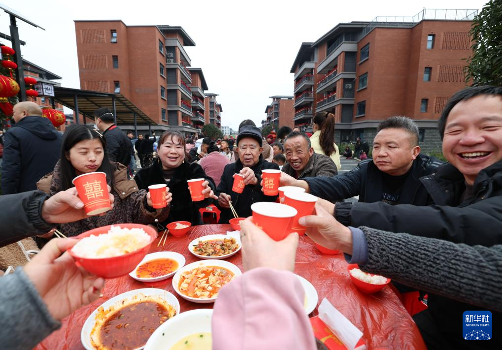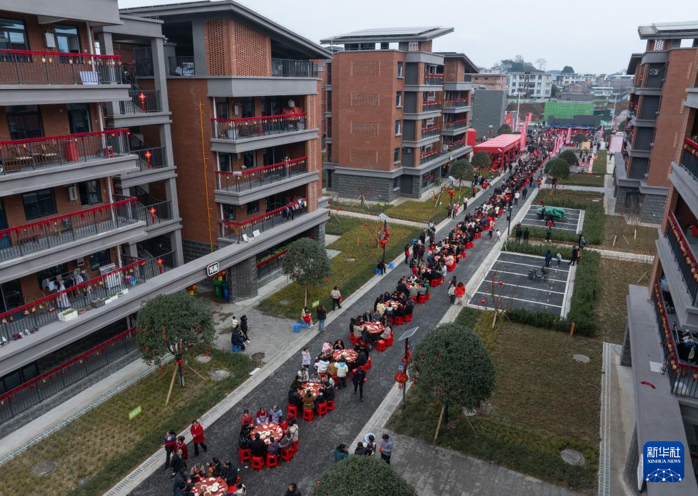 农历新年前夕,四川省宜宾市筠连县“2·8”山体滑坡灾害受灾群众陆续搬入新居。1月31日,迁入新居的群众在家门前举办百家宴活动喜迎新年。