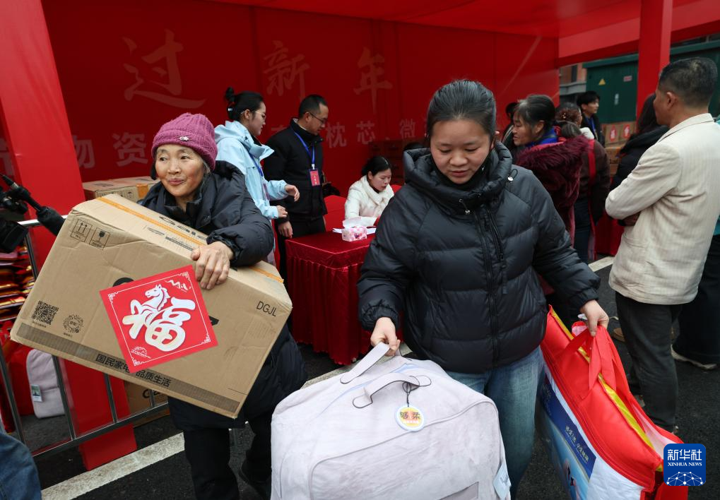 1月31日,在四川省宜宾市筠连县沐爱镇金坪村搬迁安置区,喜迁新居的受灾群众领取免费物资。