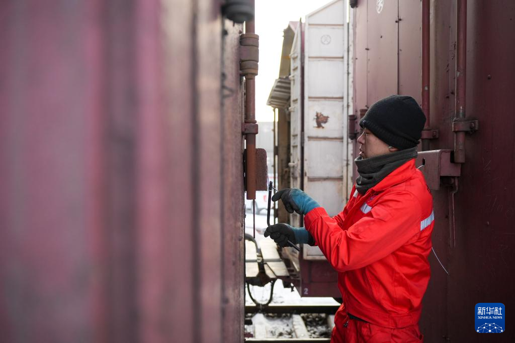 1月31日,在新疆乌鲁木齐中铁特货乌鲁木齐分公司三坪物流基地,工作人员关闭列车车厢。