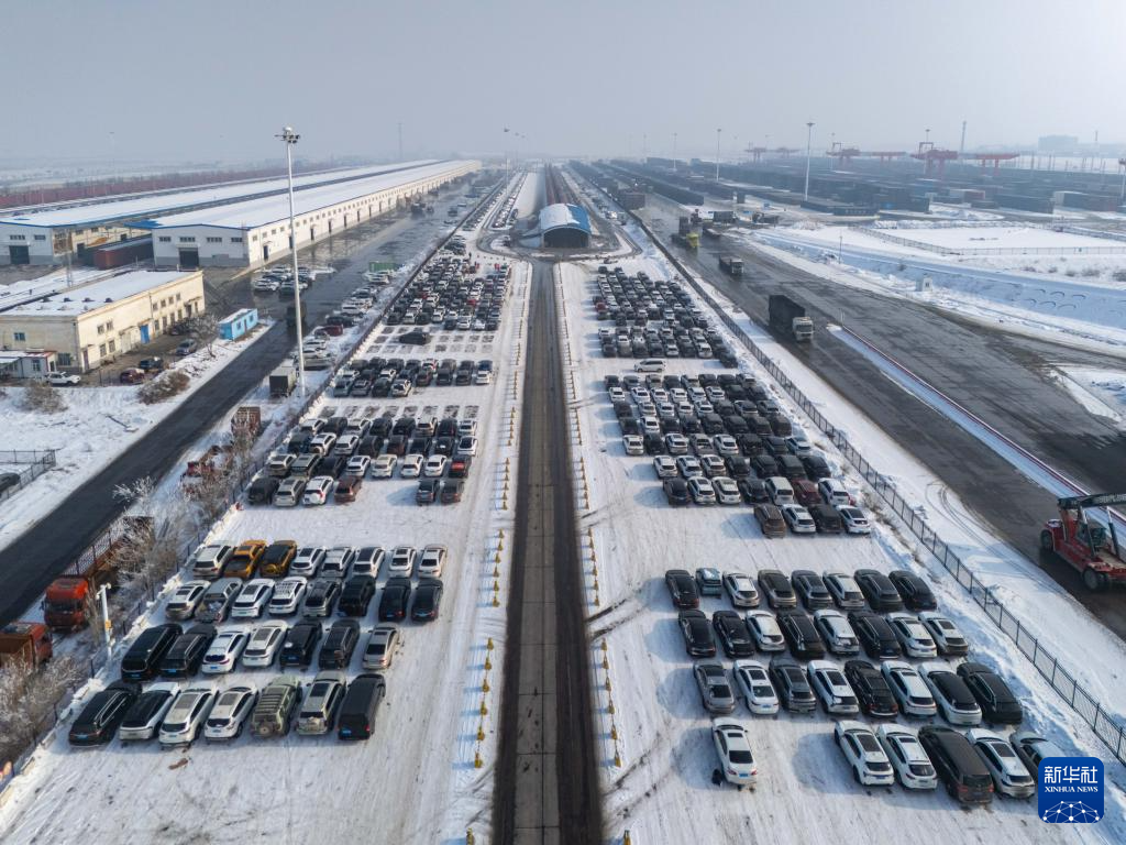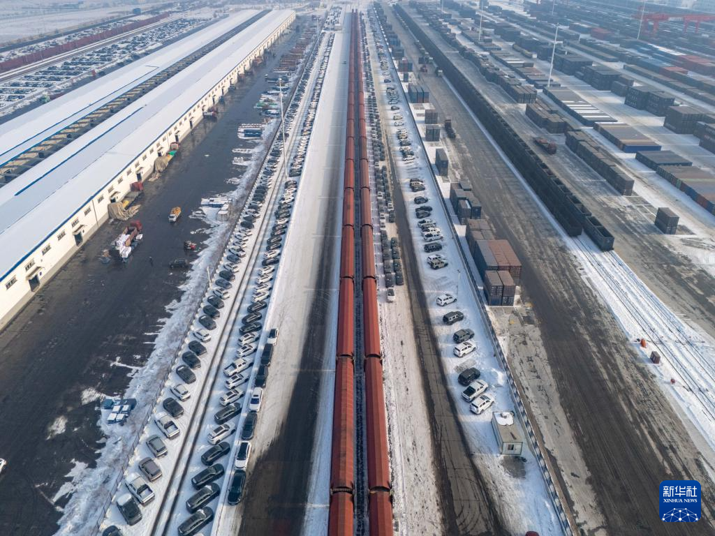 1月31日,在新疆乌鲁木齐中铁特货乌鲁木齐分公司三坪物流基地,工作人员驾驶待托运车辆驶入列车(无人机照片)。