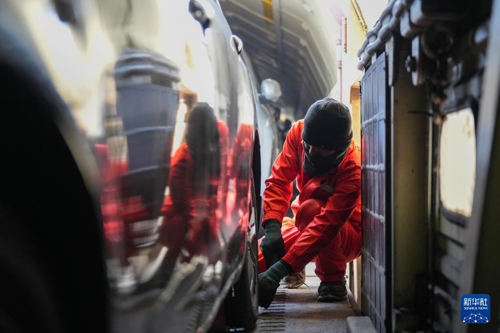 1月31日,在新疆乌鲁木齐中铁特货乌鲁木齐分公司三坪物流基地,工作人员在列车中固定待托运车辆。